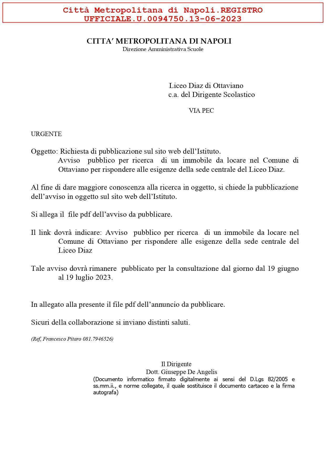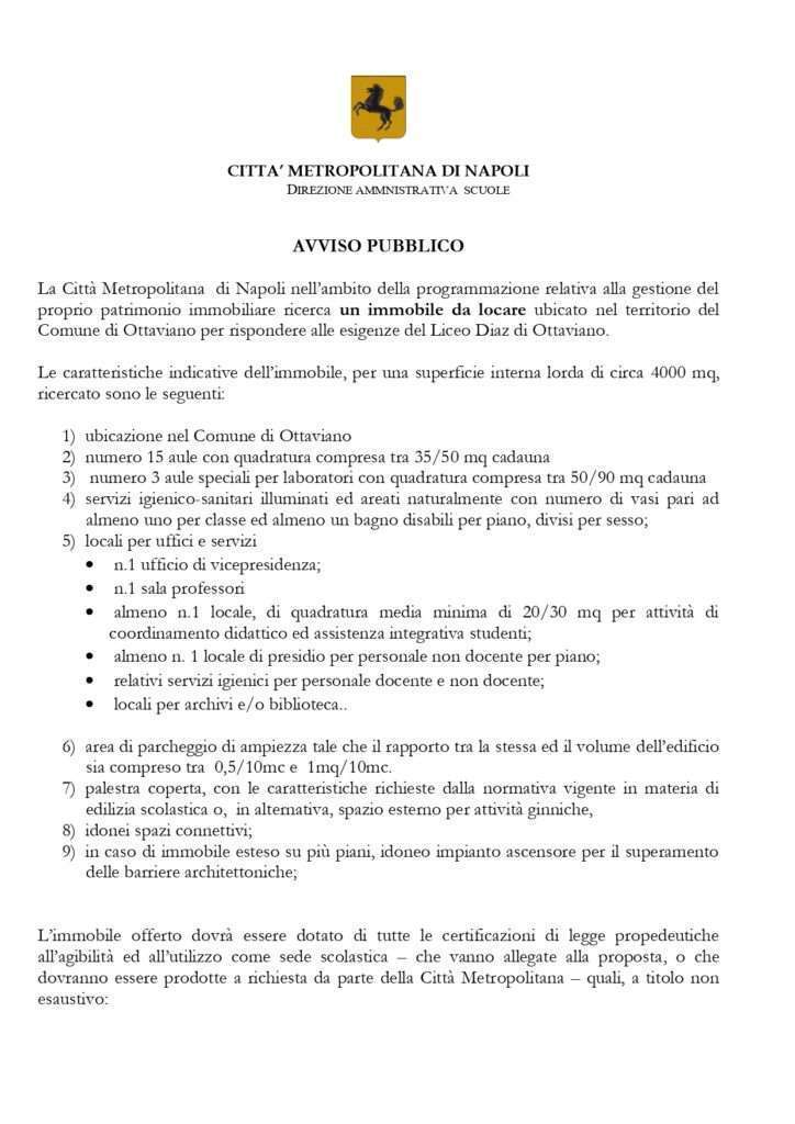 Avviso pubblico per ricerca di un immobile da locare nel Comune di Ottaviano per rispondere alle esigenze della sede centrale del Liceo Diaz.